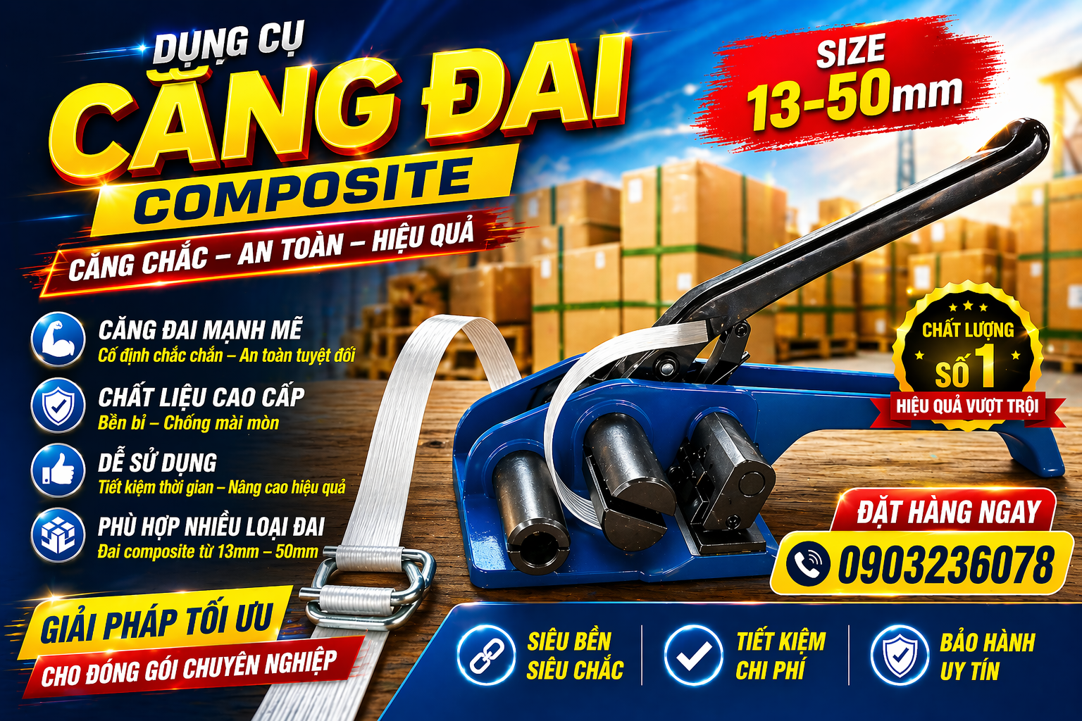 Dụng cụ căng dây đai Composite là thiết bị không thể thiếu trong quá trình đóng gói hàng hóa, giúp siết chặt dây đai composite một cách chắc chắn, đảm bảo an toàn tuyệt đối cho kiện hàng trong quá trình vận chuyển hoặc lưu kho.