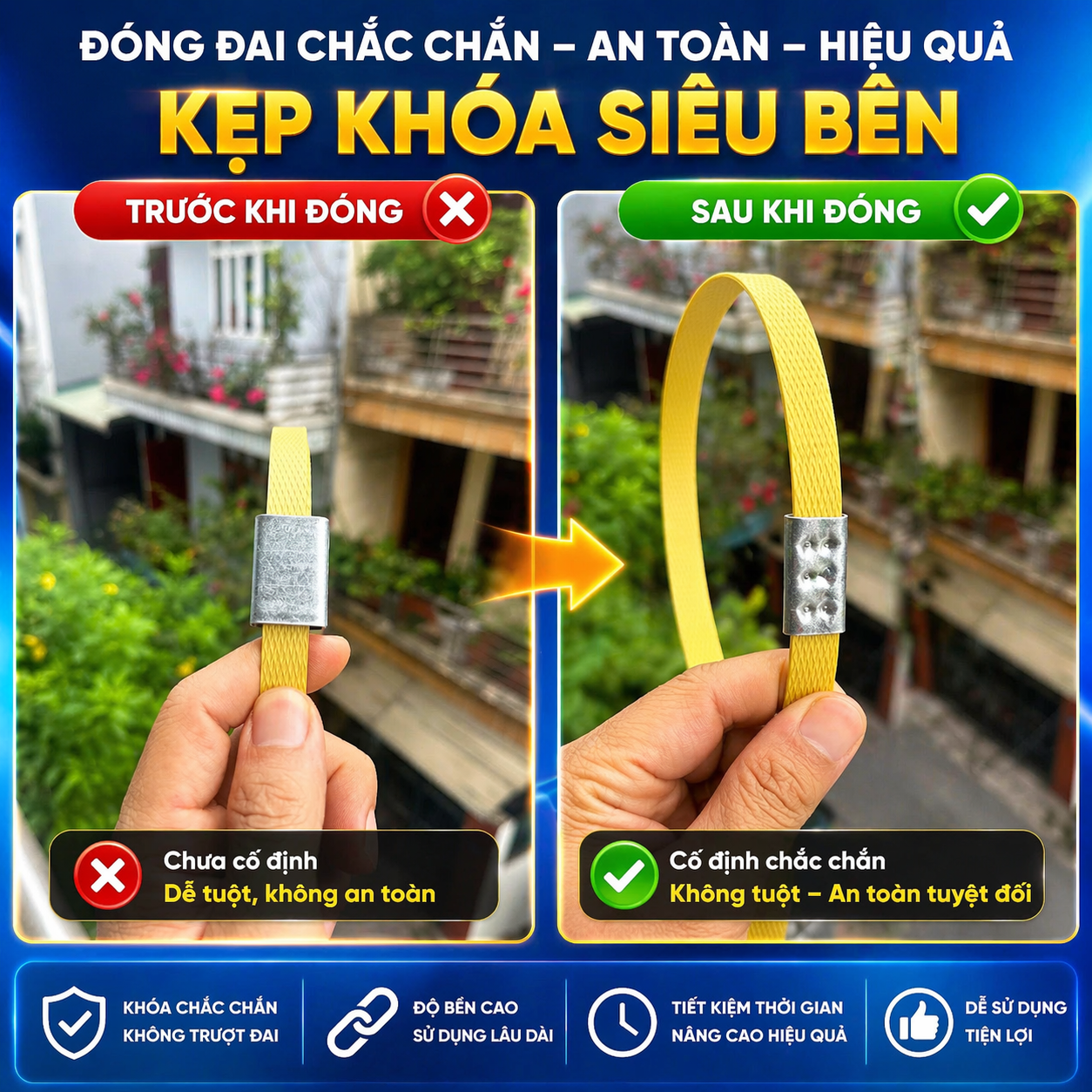 ✓ Tương thích đa dạng: Sử dụng cho các loại dây đai nhựa PET, PP hoặc dây composite phổ biến hiện nay.