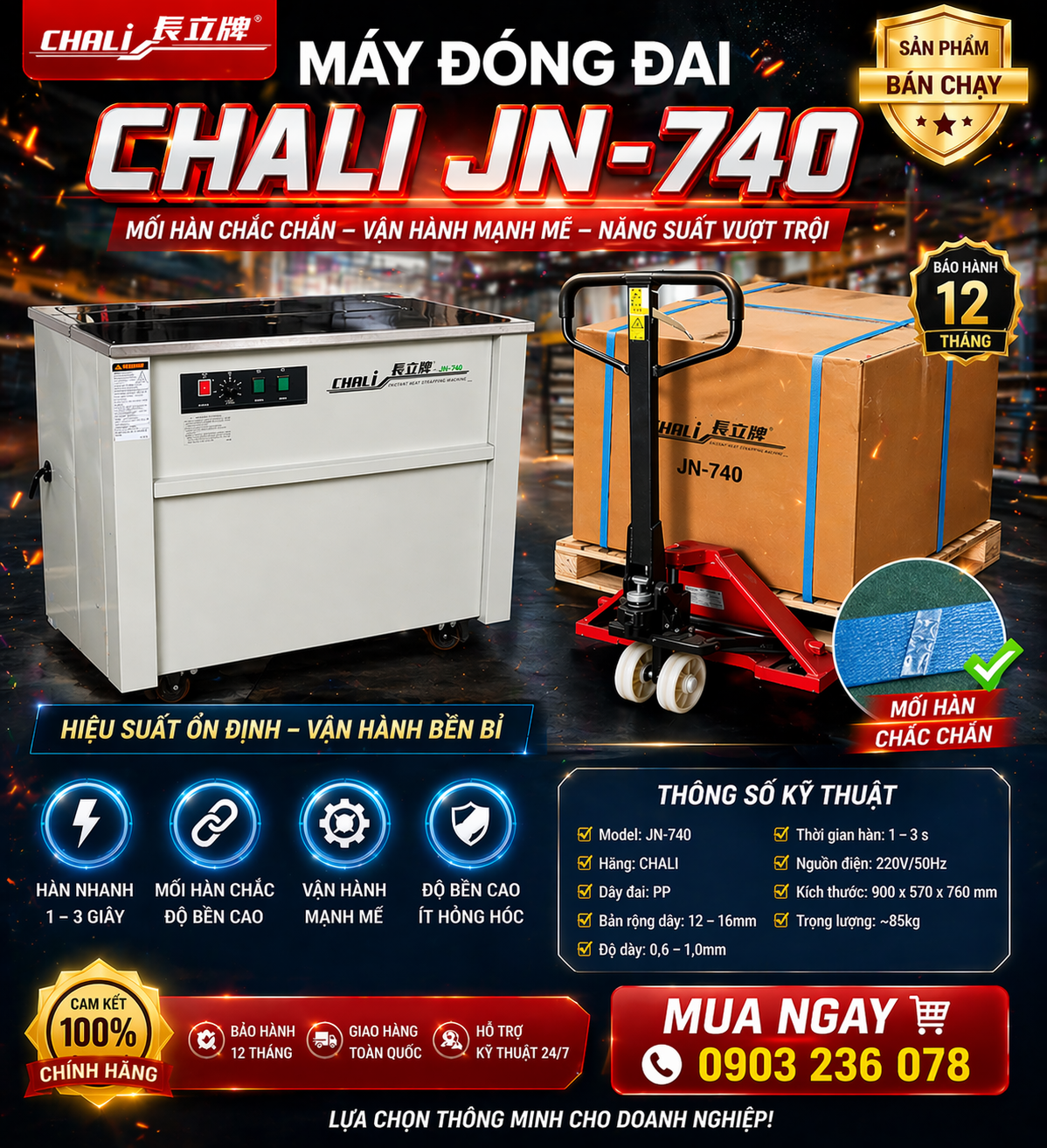 Máy đóng đai JN-740 thương hiệu CHALI là giải pháp lý tưởng cho doanh nghiệp trong việc đóng gói hàng hóa nhanh chóng, chắc chắn và tiết kiệm chi phí. Với thiết kế hiện đại, vận hành đơn giản và hiệu quả cao, JN-740 là lựa chọn phổ biến trong các ngành như: logistic, kho bãi, sản xuất công nghiệp, thương mại điện tử…