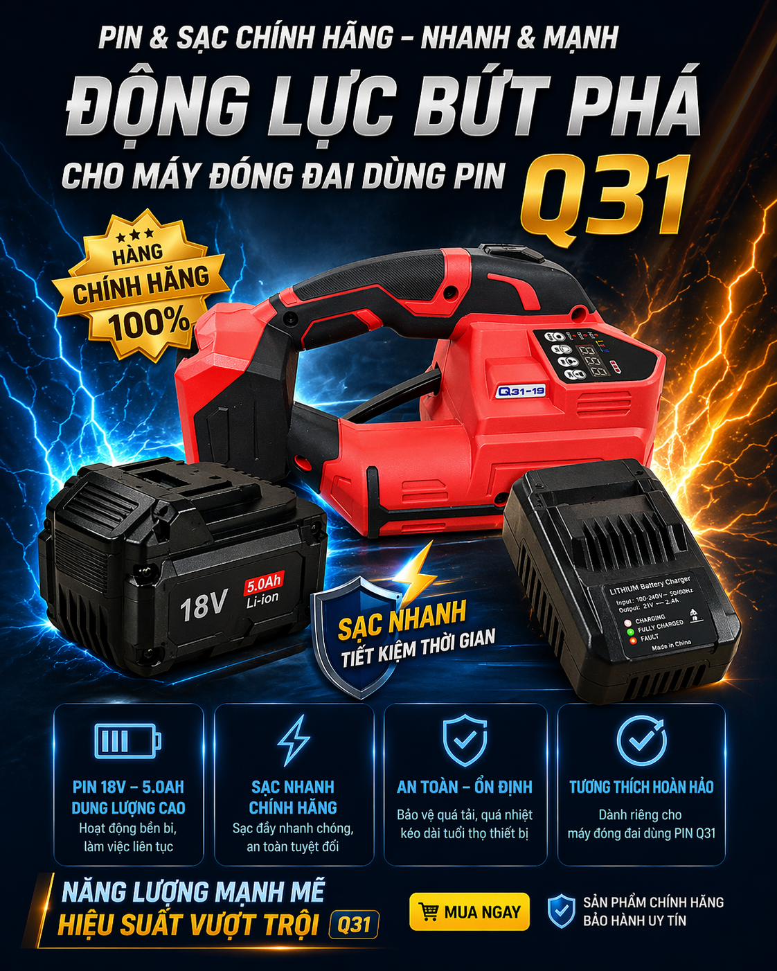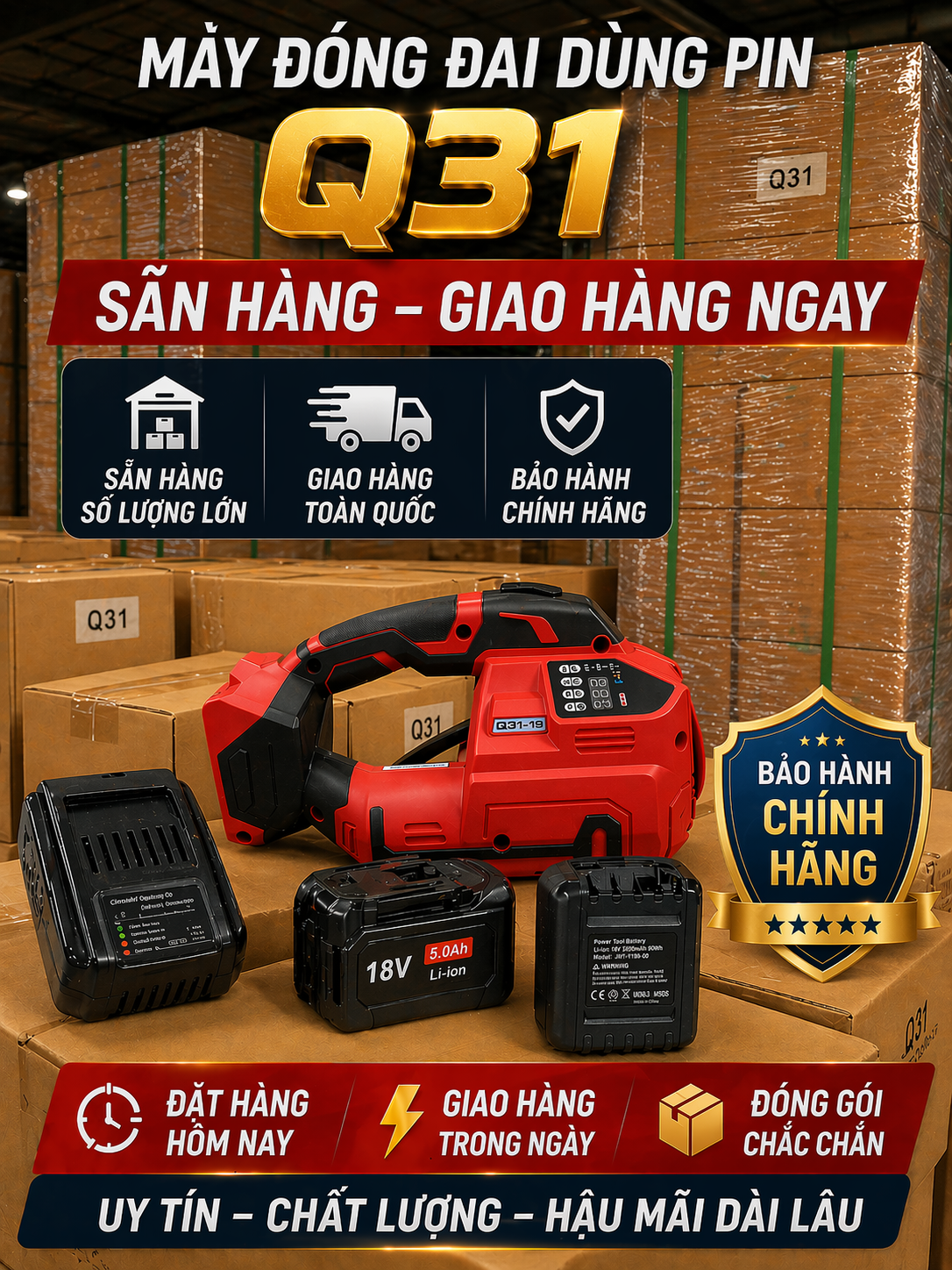 ✓ Máy đóng đai dùng pin Q31 chính là lựa chọn hoàn hảo cho doanh nghiệp. Với thiết kế cầm tay gọn nhẹ, pin Lithium dung lượng lớn, lực siết mạnh mẽ và tiêu chuẩn tiết kiệm năng lượng – bảo vệ môi trường, dòng máy này giúp tăng hiệu quả sản xuất, giảm chi phí vận hành và đáp ứng yêu cầu đóng gói bền vững trong thời đại mới.