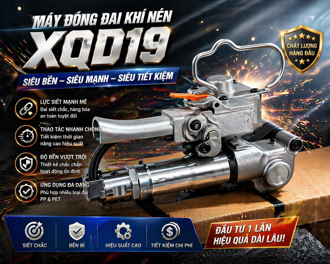 Máy đóng dây đai XQD19 là thiết bị chuyên dùng để siết và hàn dây đai nhựa PET/PP trong quy trình đóng gói hàng hoá. Với thiết kế nhỏ gọn, hoạt động bằng ký nén, XQD19 là lựa chọn tối ưu cho các doan nghiệp cần đóng gói nhanh, hiệu quả và tiết kiệm chi phí.